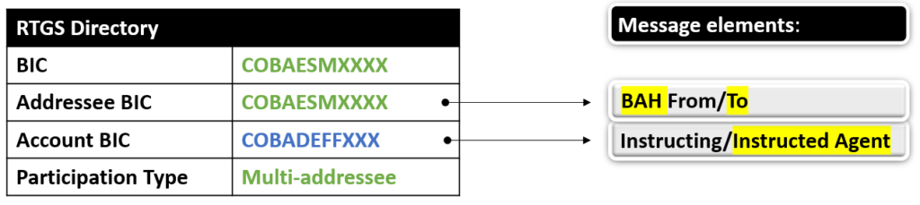 In the above extract from RTGS Directory, we can see that COBAESMXXXX is registered in T2 as a Multi-addressee.